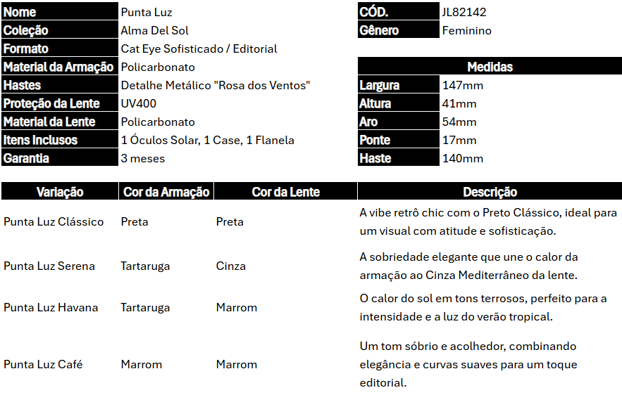 O Punta Luz traz a luminosidade de Punta del Este e a intensidade do verão tropical. Com curvas delicadas e acabamento impecável, este modelo Cat Eye Suave possui um detalhe metálico na lateral que representa uma Rosa dos Ventos estilizada, conferindo uma sofisticação editorial que guia a jornada da Alma Del Sol.