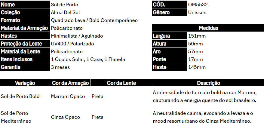 O Sol de Porto é inspirado no Porto da Lagoa, destino querido pelos hermanos no verão. Ele combina linhas modernas com lentes luminosas, refletindo a energia quente dos dias de praia. É um modelo marcante, elegante e com presença, em um formato quadrado leve/bold contemporâneo.